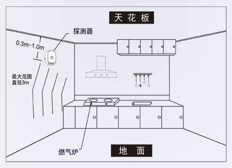 由于天然气主要成分是甲烷,比空气轻,所以家用天然气报警器尽量在距离厨房房顶30-60cm、靠近气源1.5m范围的地方固定安装,最好远离油烟机、远离蒸汽,避免引起误报警或导致探测器进气孔进气不畅,从而影响报警器灵敏度“该响的时候不响”。