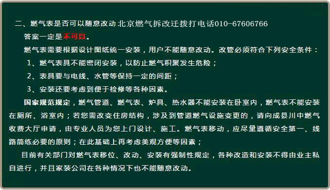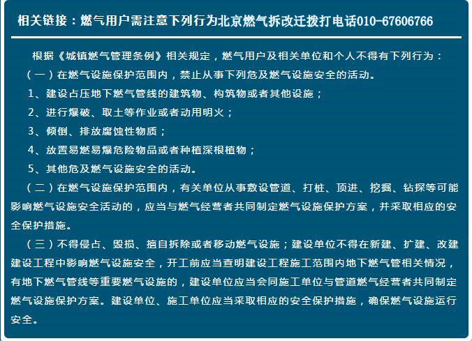 北京燃气拆改迁电话,北京燃气改管、北京燃气改造、北京改燃气、北京家庭装修改燃气都需要拨打北京燃气拆改迁电话。北京燃气改管改造必须由北京燃气公司专业拆改迁工作人员施工,其他各人或其他单位均不得改动北京市燃气管线。